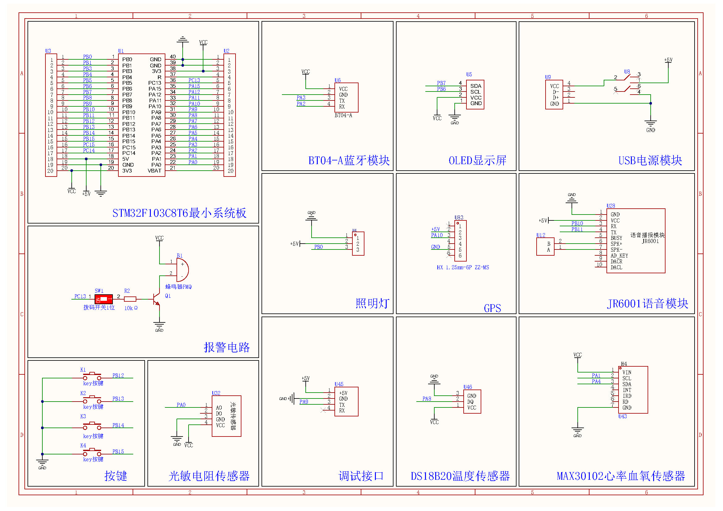 - 环境采集:光照强度传感器采集环境光照强度、心率血氧传感器检测宠物的心率血氧数据、温度传感器检测宠物的体温数据、GPS模块检测宠物的位置信息