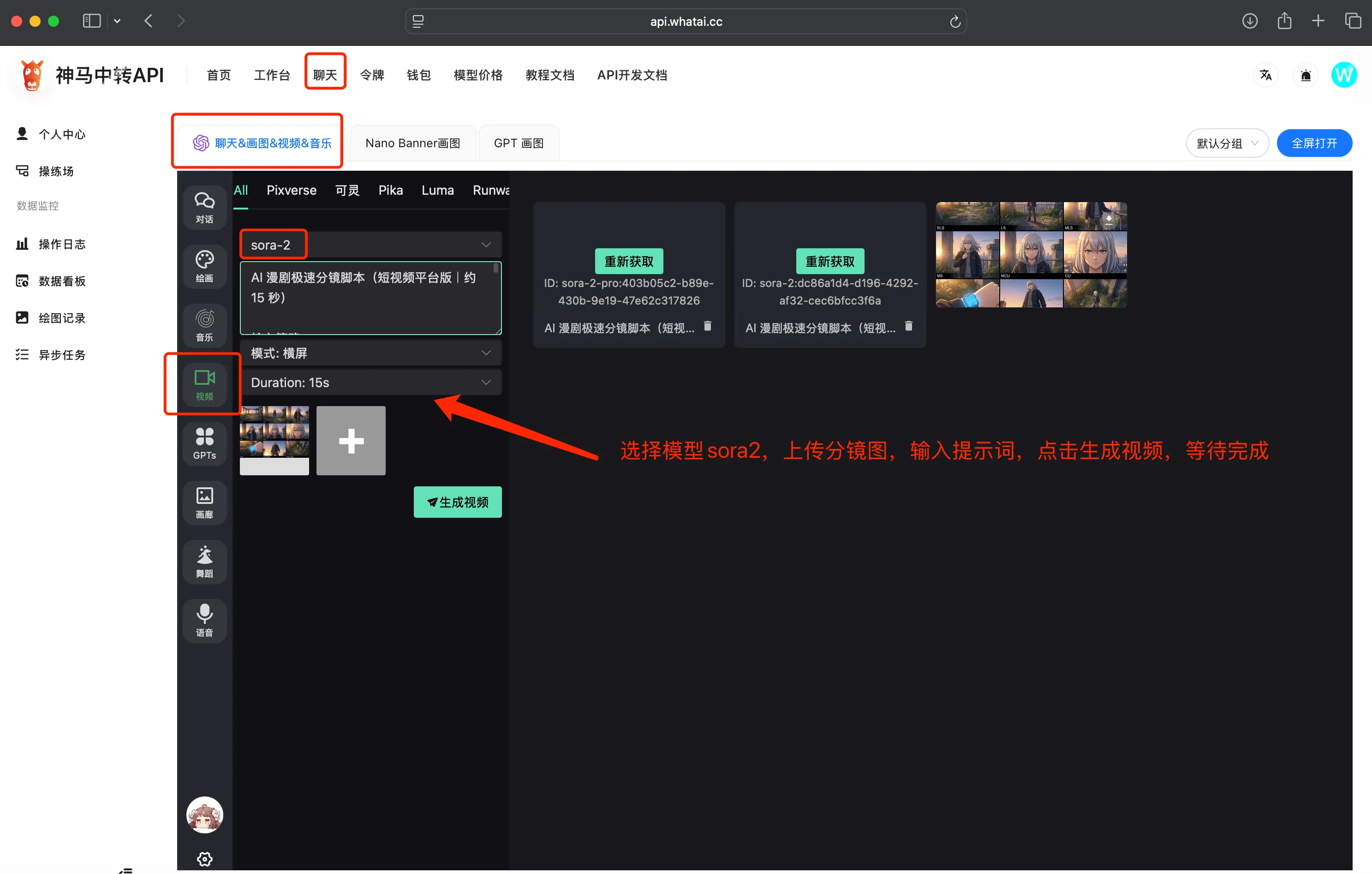 神马中转API,顶部菜单-聊天-视频-输入提示词:
