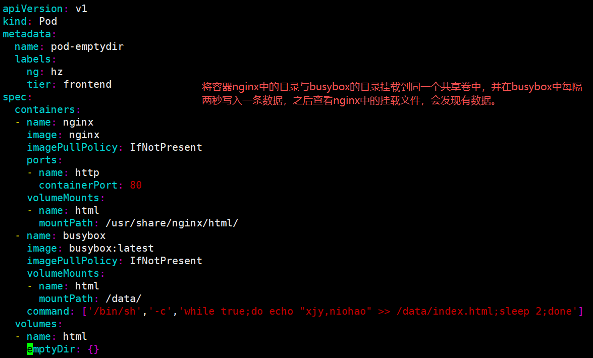 第一步 创建pod容器(这里以nginx与busybox为例,共享卷的名字为html)