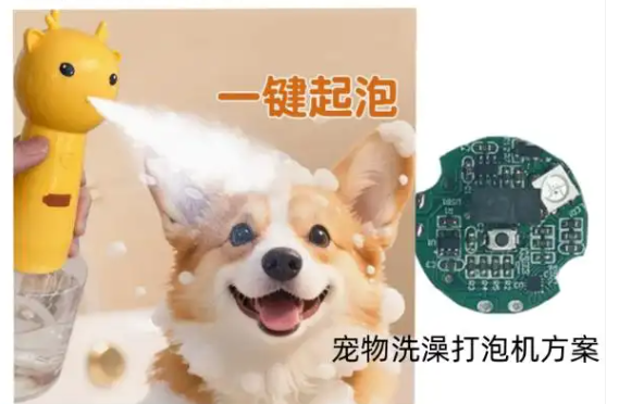 宠物洗澡打泡机主要用于将宠物沐浴液与水混合,通过内部电机/泵产生丰富、细腻的泡沫,直接涂抹在宠物身上,以提升清洁效率和体验。