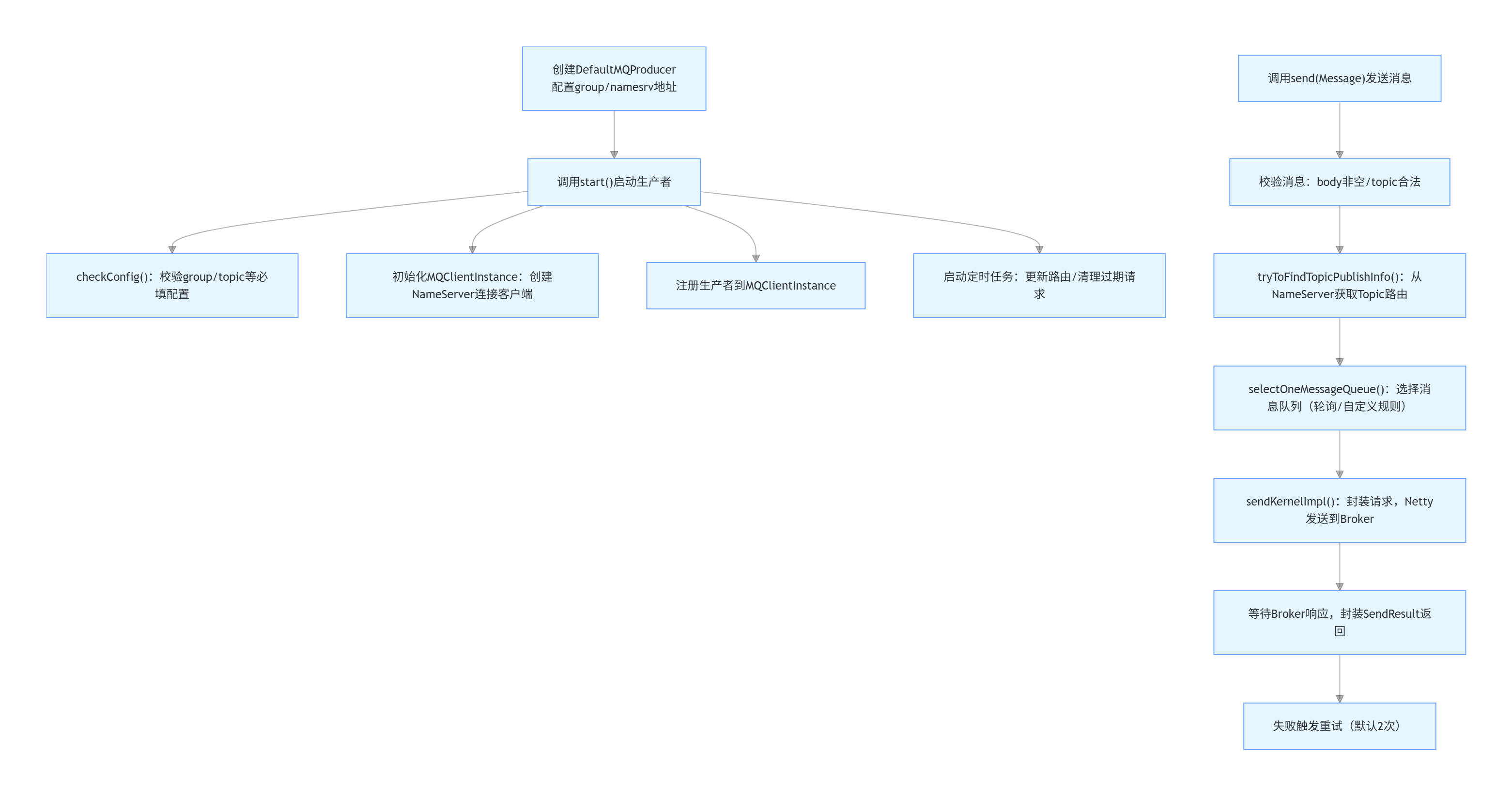 DefaultMQProducer:门面类,仅暴露start()/send()等 API,所有逻辑委托给DefaultMQProducerImpl;DefaultMQProducerImpl:生产者核心,包含启动、消息发送、路由获取等全部逻辑;MQClientInstance:管理与 NameServer/Broker 的连接,维护路由信息,是生产者 / 消费者的公共依赖。