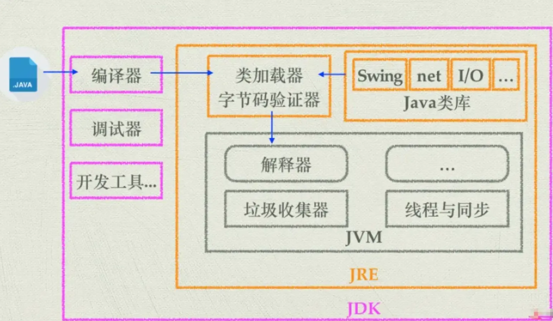 JDK(Java Development Kit):开发工具包,包含编译器、调试工具等