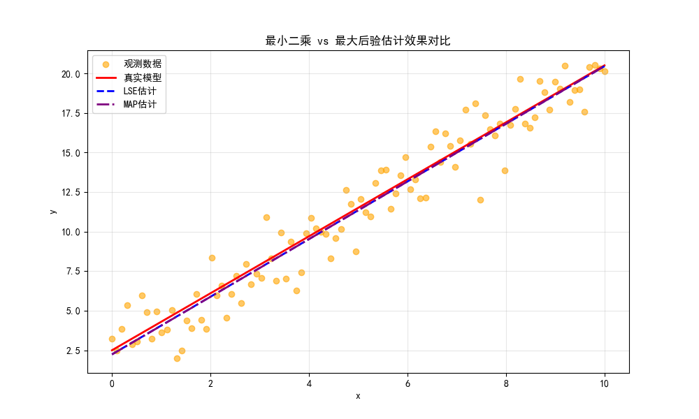 - 图中会显示:真实模型(红色实线)、带噪声的观测数据(橙色散点)、最小二乘估计模型(蓝色虚线)。