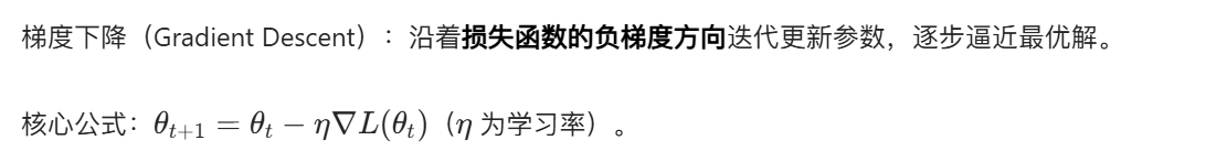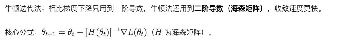 - 优化方法:梯度下降简单易实现,适合大数据场景;牛顿法收敛快但计算成本高,适合小数据 / 简单模型;随机梯度法通过采样提升迭代速度;
