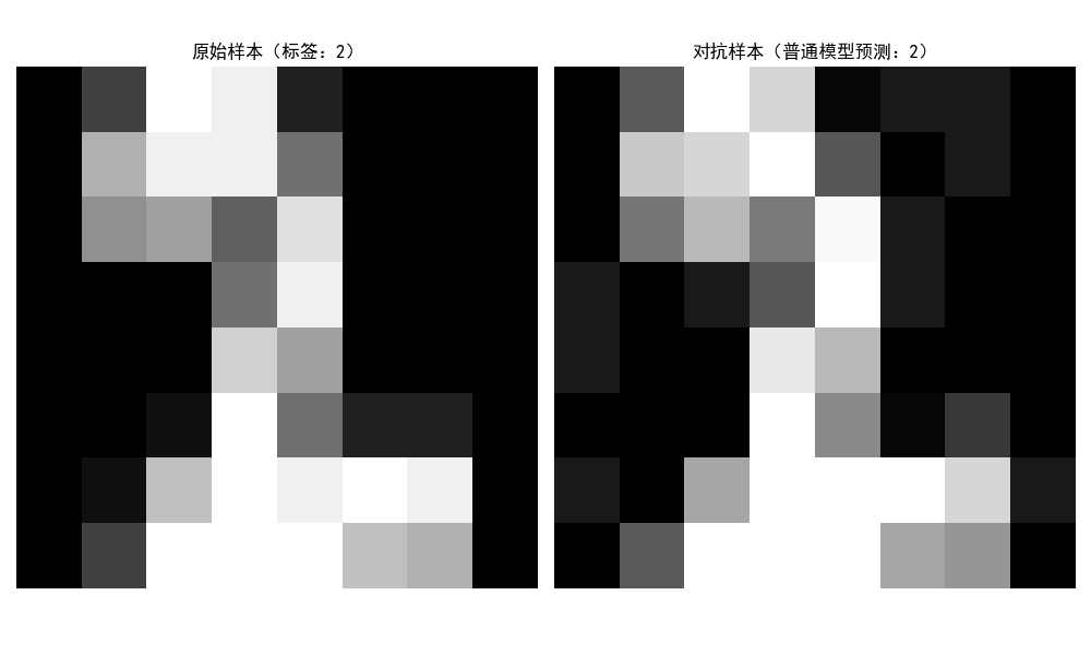 - 左图是原始手写数字样本,右图是加入微小扰动的对抗样本;