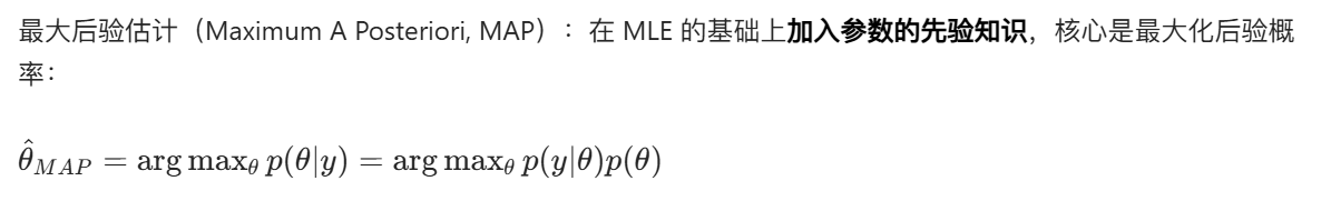 - 参数估计:最小二乘是无分布假设的拟合方法,最大似然是基于数据分布的 "可能性最大化",最大后验则在似然基础上加入了参数先验;
