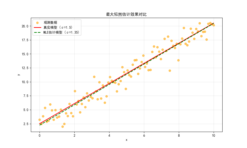 print(f"MLE估计参数:截距={theta_mle[0]:.2f}, 斜率={theta_mle[1]:.2f}, 噪声σ={theta_mle[2]:.2f}")