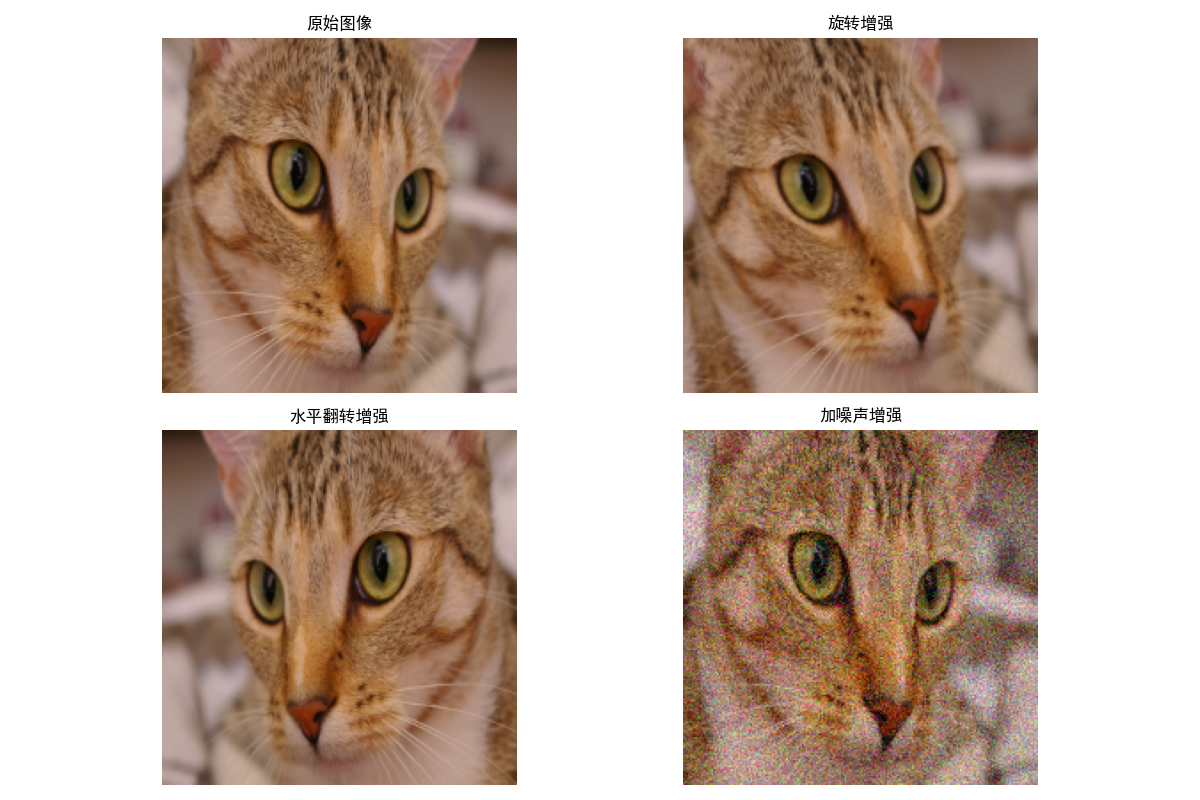 - 同一幅猫咪图像,通过旋转、翻转、加噪声生成 4 种不同的样本,直观展示样本增强的效果。