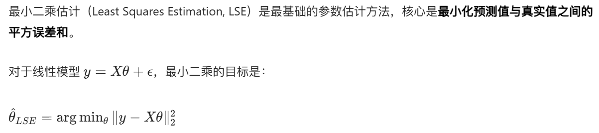 最大似然估计(Maximum Likelihood Estimation, MLE):找到一组参数,让观测数据出现的 "可能性" 最大。对于高斯噪声的线性模型,MLE 等价于最小二乘,但 MLE 的适用范围更广(可处理任意分布的似然函数)。