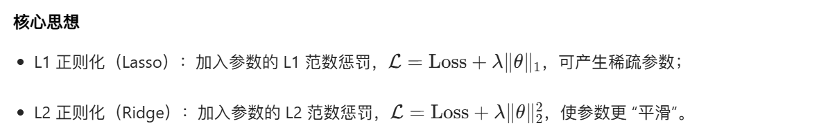 - 正则化策略:范数惩罚通过约束参数防止过拟合,样本增强通过扩充数据提升泛化能力,对抗训练通过加入扰动提升模型鲁棒性。