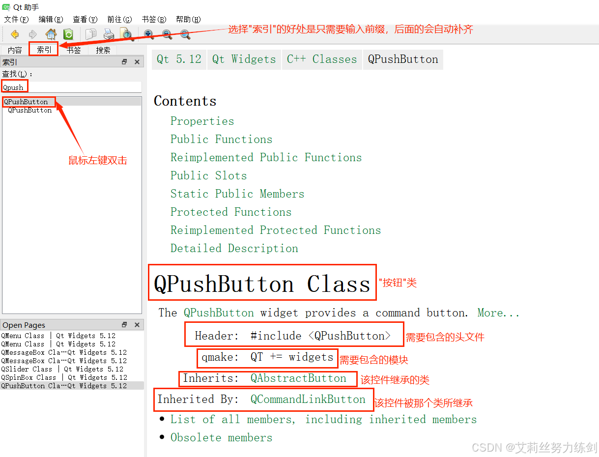 2、打开帮助手册,在"索引"里面输入"QpushButton"。