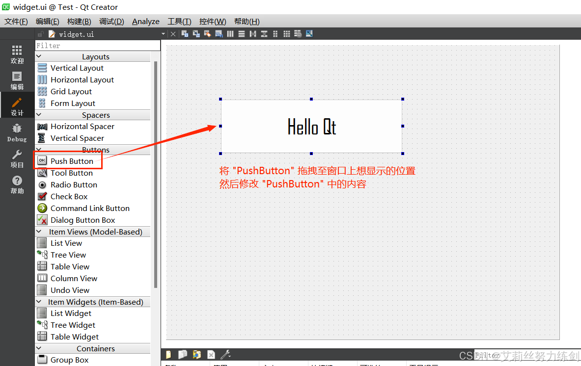 1、新建项目,在新建的项目中使用Qt中的"QpushButton"控件。