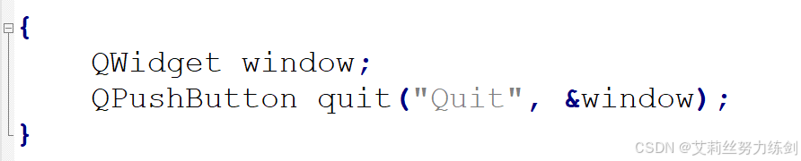 | 对象创建方式 | 父对象 (window) 与子对象 (quit) 均在栈上创建。 |