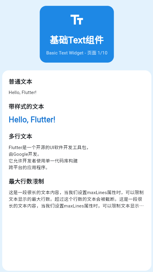 Text是Flutter中最基础、最常用的组件,用于显示文本内容。了解Text组件是掌握Flutter UI开发的第一步。