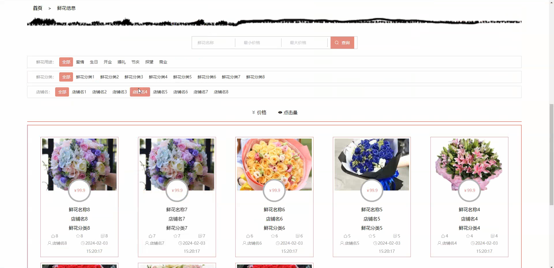- 鲜花浏览与搜索:按用途(庆典、日常)、寓意(浪漫、感恩)、季节(春、夏)等多维度分类展示,支持关键词搜索,方便用户快速找到目标鲜花。