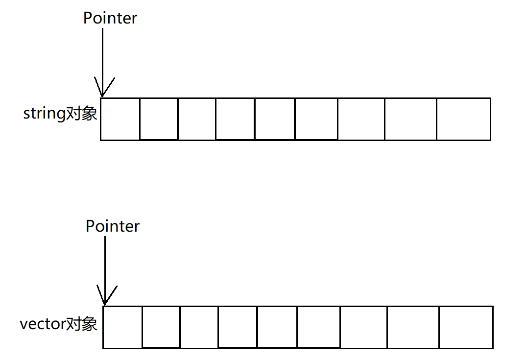 - 因为string和vector对象都将数据存储在了一块连续的内存空间,我们通过指针进行自增、自减以及解引用等操作,就可以对相应位置的数据进行一系列操作,因此string和vector当中的迭代器就是原生指针.