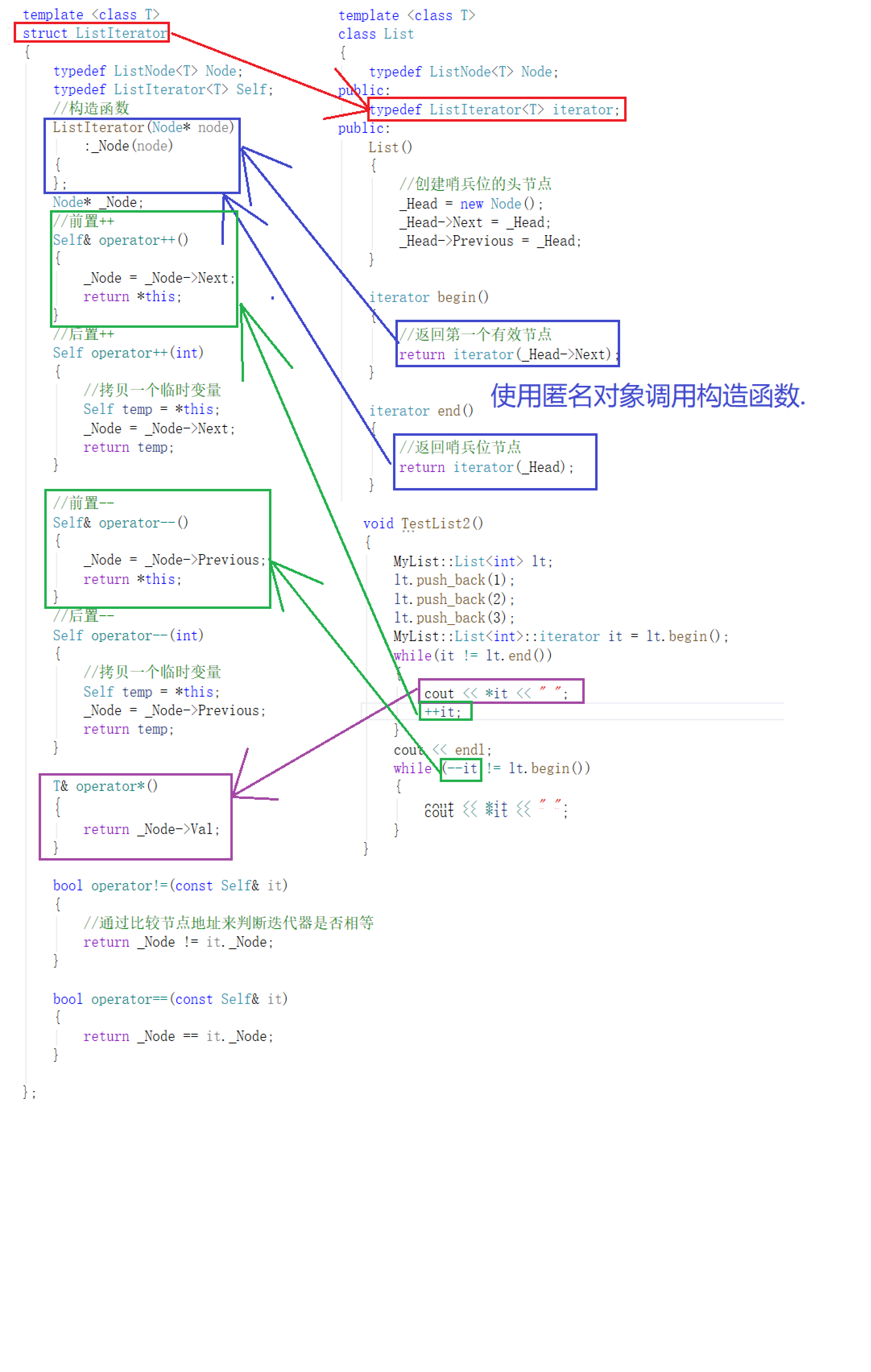而一个结点需要存储的信息有:数据、前一个结点的地址、后一个结点的地址,于是该结点类的成员变量也就出来了(数据、前驱指针、后继指针)。而对于该结点类的成员函数来说,我们只需实现一个构造函数即可。因为该结点类只需要根据数据来构造一个结点即可,而结点的释放则由list的析构函数来完成。