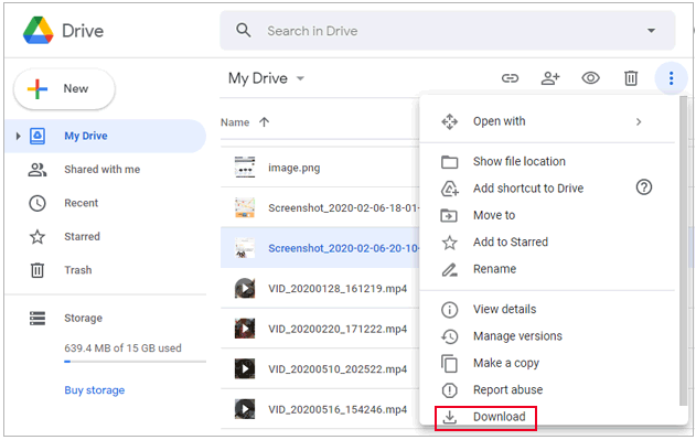 步骤 5. 如果音乐文件备份在特定文件夹(而不是回收站)中,请导航至"我的云端硬盘",找到该文件夹,选择文件,然后点击"下载"将其保存到您的 POCO 手机。