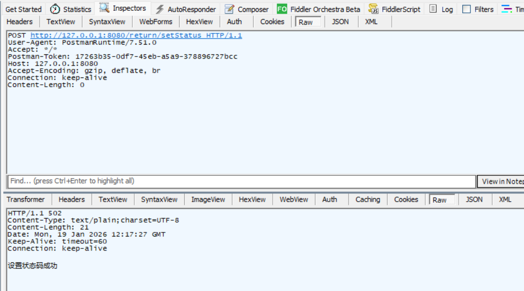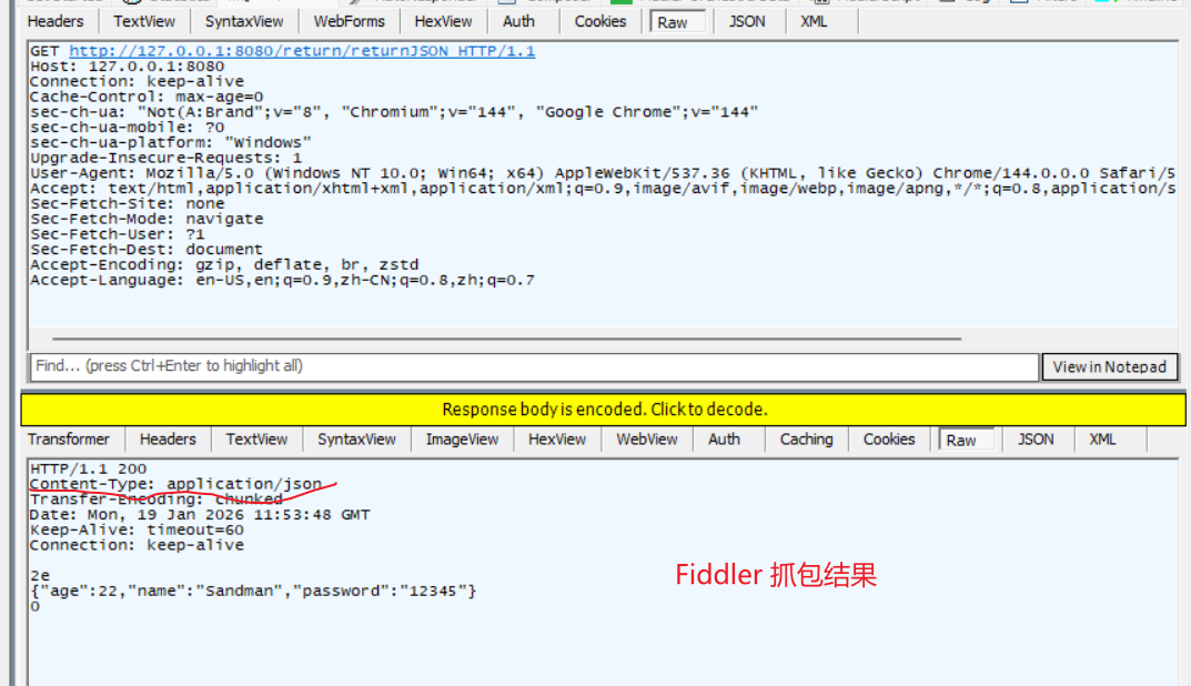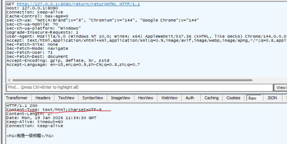 我们接下来通过 Fiddler 抓包观察下响应结果,Content-Type 类型为 text/html,text/html 是 HTTP 协议中用于标识 "响应体为 HTML 格式" 的标准类型,这是浏览器能够解析 HTML 代码的核心原因。