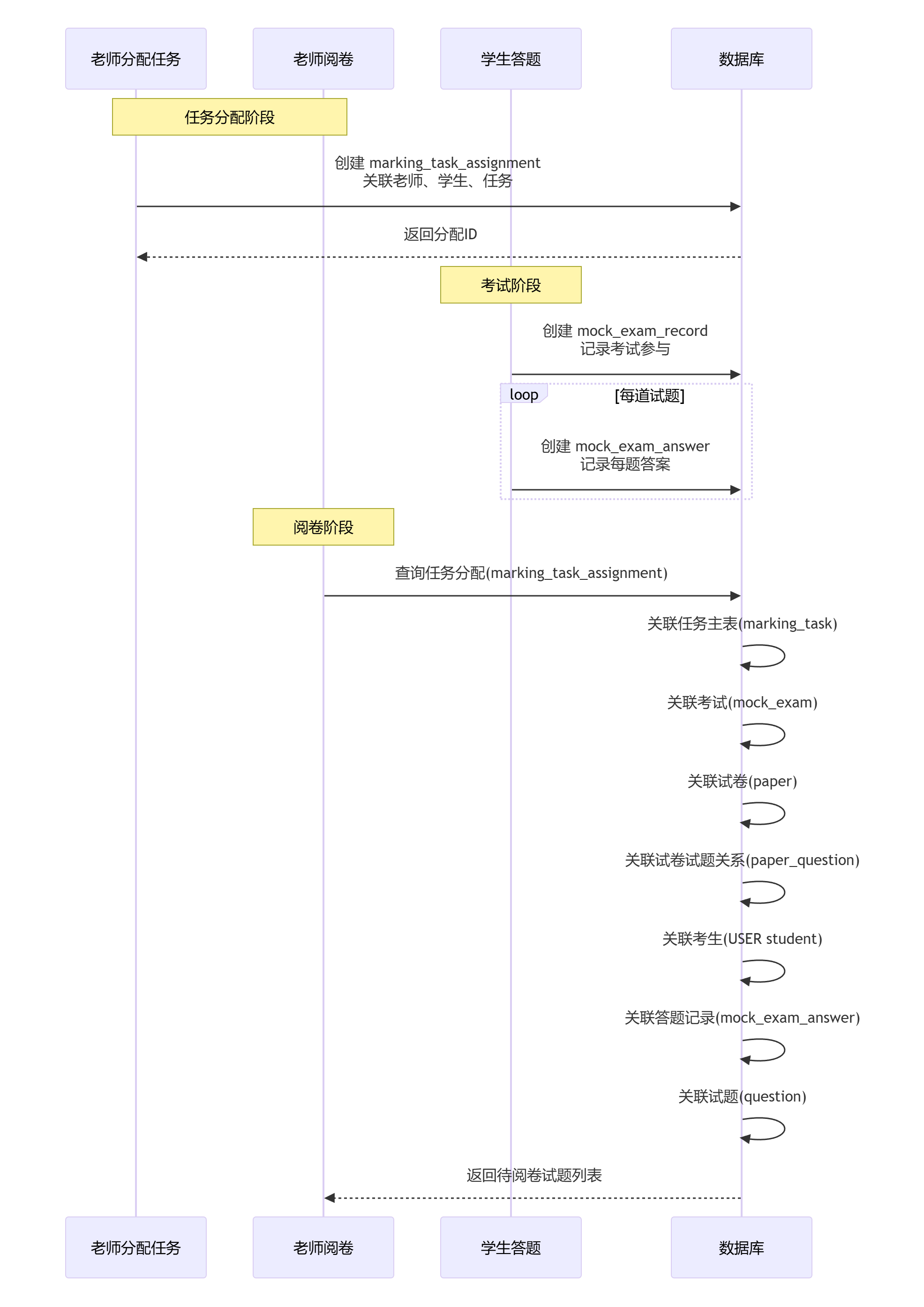 所有关联都是「业务真实发生的流程」,没有凭空关联,没有跳过核心环节,拿到的每一个数据都有「业务归属」,比如:试题属于试卷、试卷属于考试、考试属于阅卷任务、答题记录属于考生+考试。