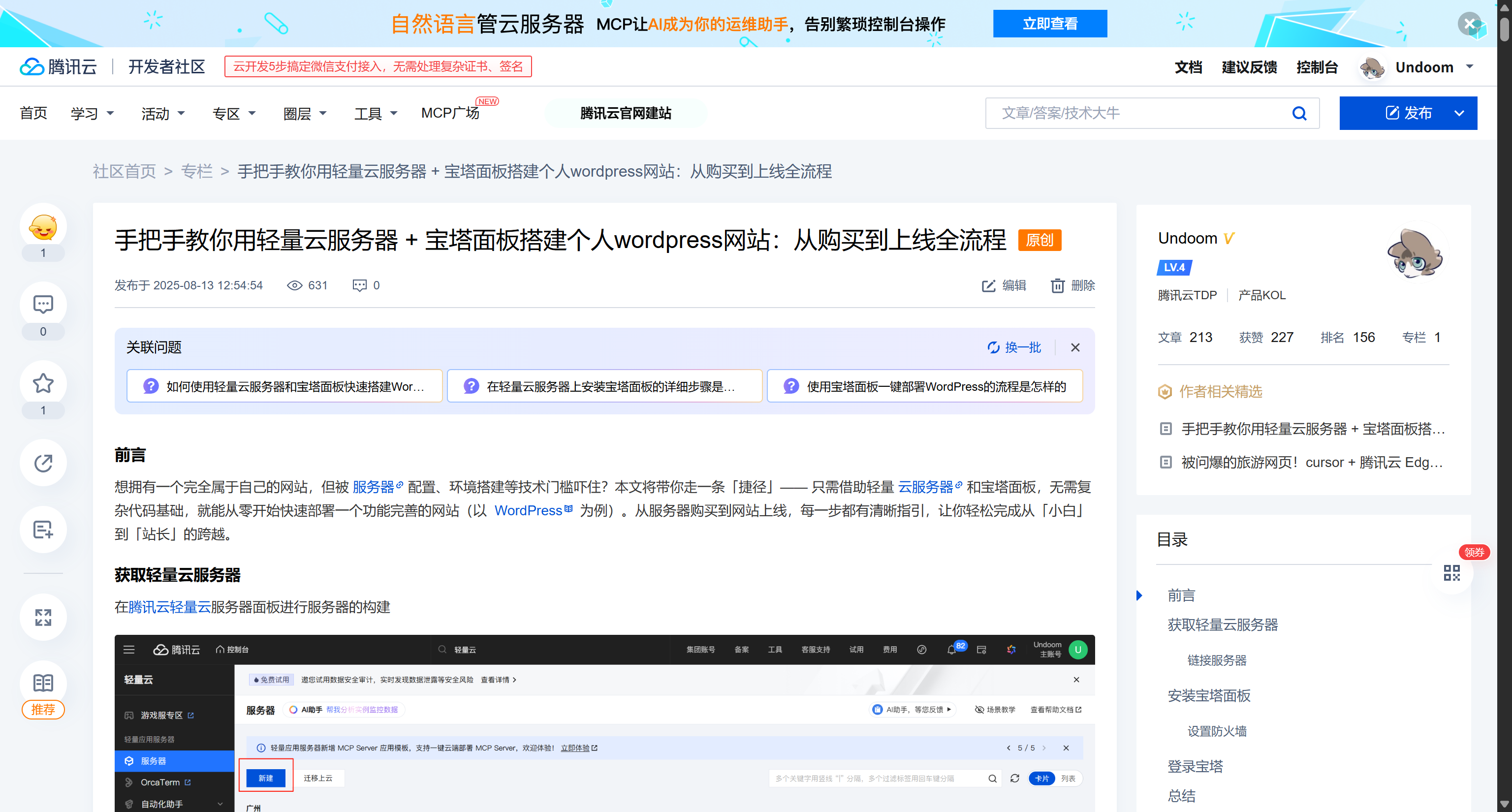 基础设施方面,利用腾讯云轻量应用服务器(Lighthouse)配合宝塔面板搭建了个人 WordPress 站点。Lighthouse 提供了开箱即用的应用镜像,而宝塔面板则简化了 Nginx、PHP、MySQL 的配置管理。这是一个经典 LAMP/LEMP 栈的现代化实践。