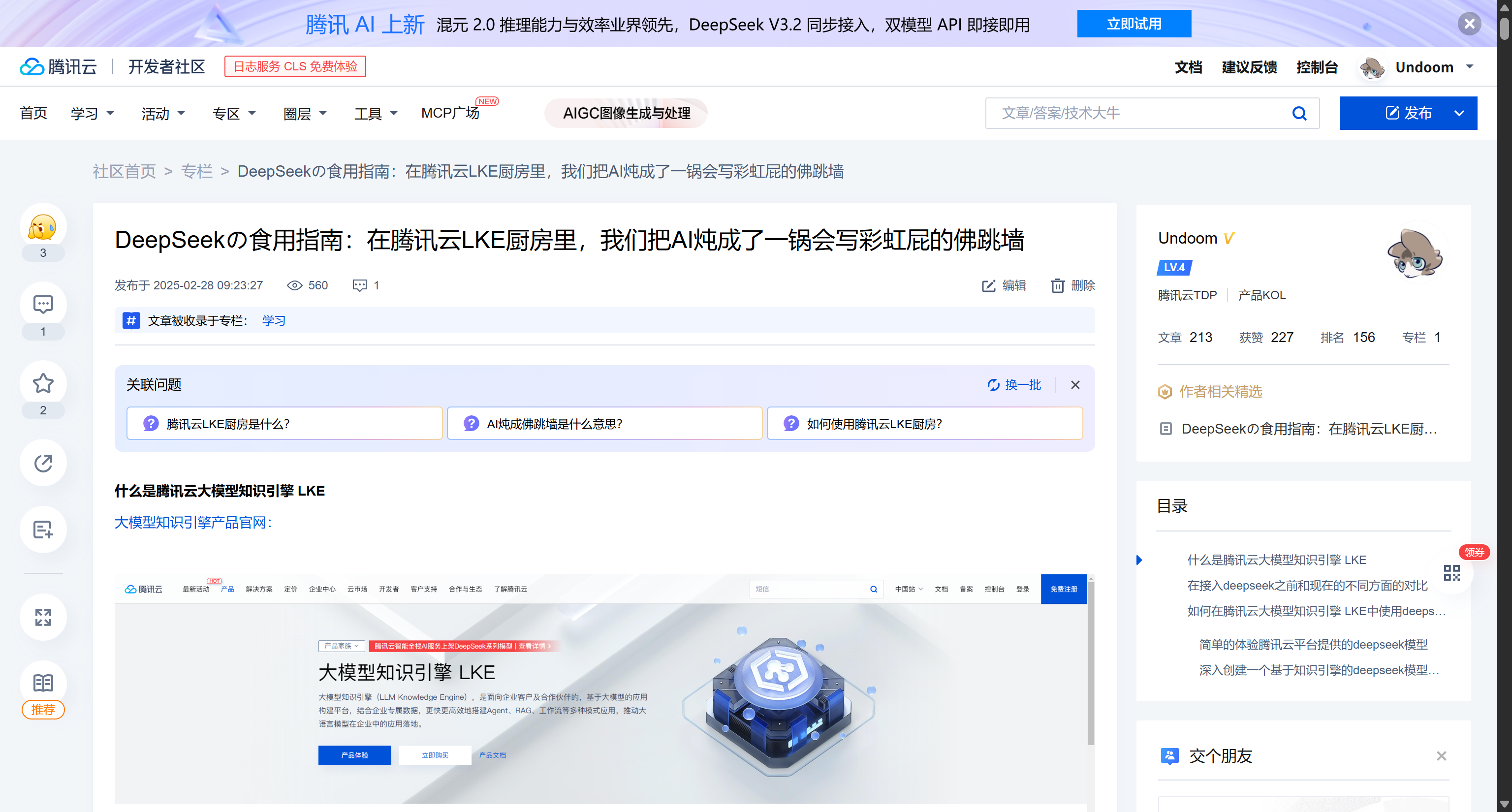 DeepSeek 强大的总结与推理能力,结合 LKE 精准的检索能力,解决了大模型普遍存在的"幻觉"问题,使得生成的内容既具有逻辑性又具备事实依据。这种架构迅速成为了企业级 AI 应用的标准范式。