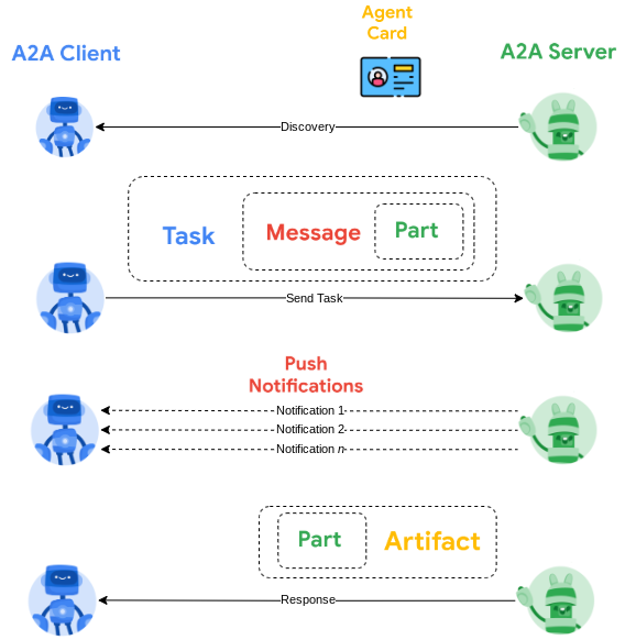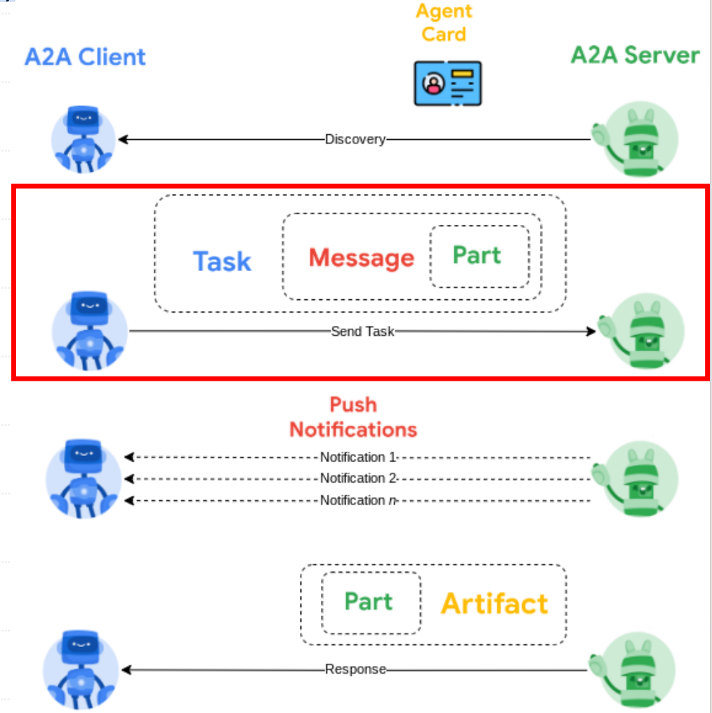1. 结构化与多模态: 通过 Task > Message / Artifact > Part 的分层结构,实现了超越纯文本的多模态信息交换。