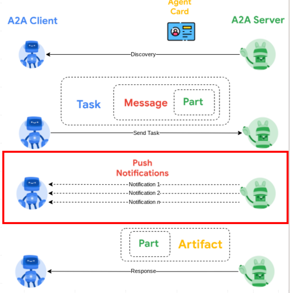 2. 异步与流式: 通过 Push Notifications(主要是 TaskStatusUpdateEvent),客户端可以实时、非阻塞地获取长任务的进度,提升了用户体验。