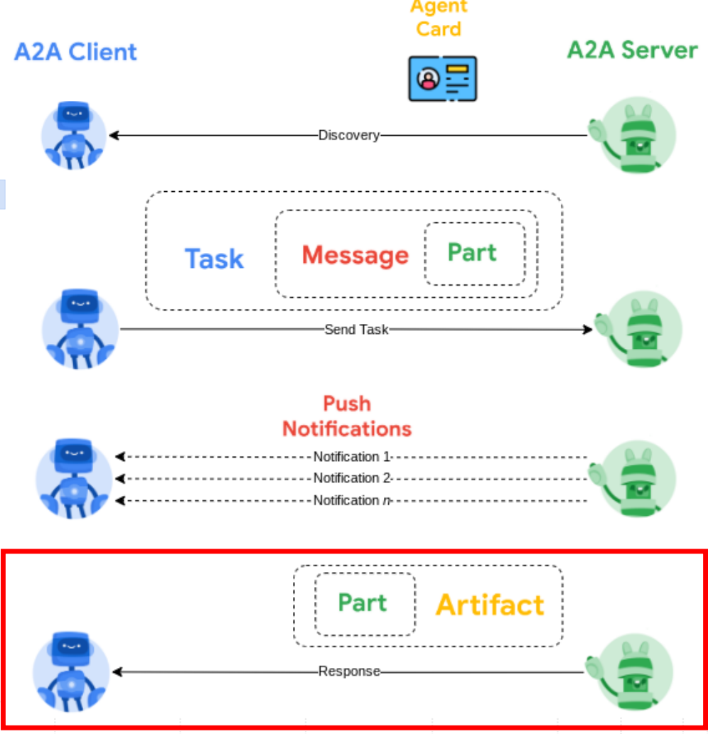 4. Artifact (工件/产出物): 任务执行完成后最终生成的成果,例如一份报告、一张图片或一个数据集。其结构与消息类似,也由一个或多个 Part 组成。