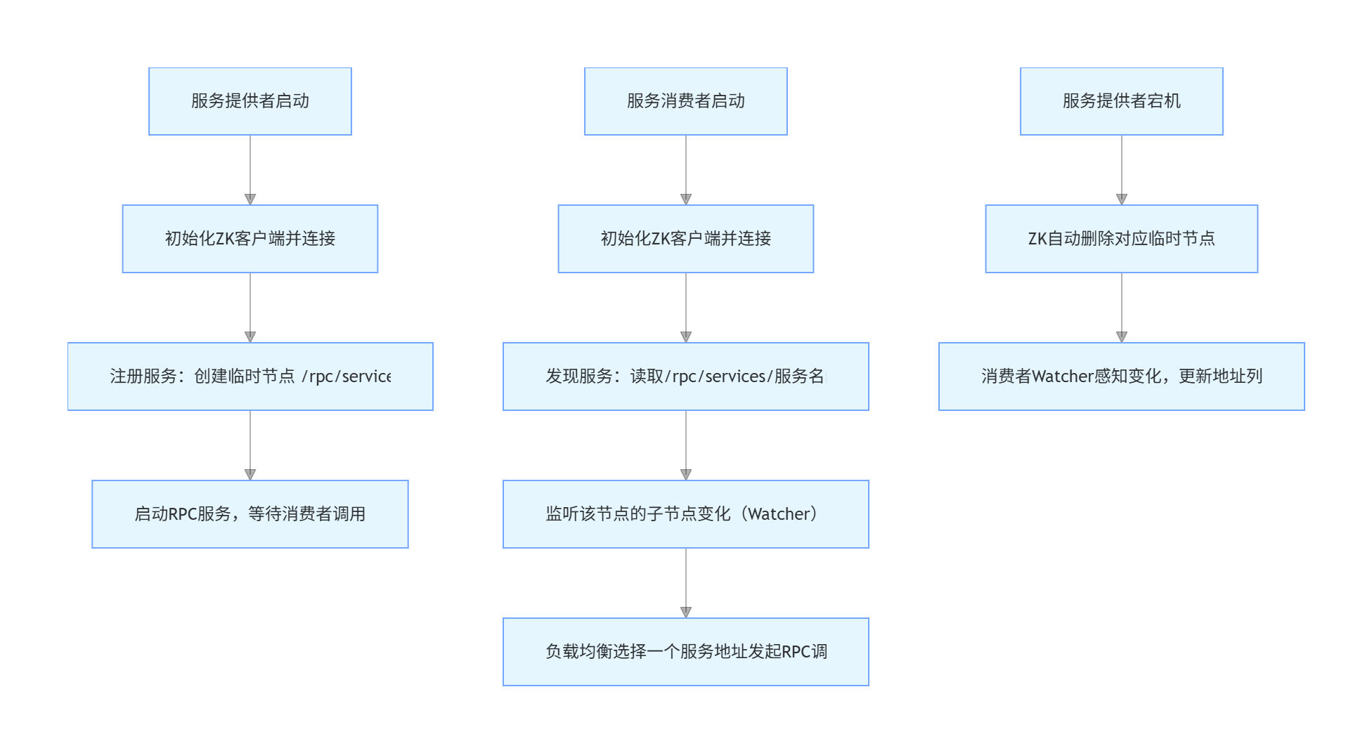Create时需传入ZOO_EPHEMERAL(临时节点),服务消费者通过GetData读取服务地址,还可扩展 Watcher 监听节点变化(感知服务上下线)。