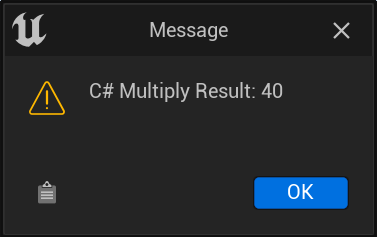 FMessageDialog::Open(EAppMsgType::Ok, FText::FromString(FString::Printf(TEXT("C# Multiply Result: %d"), Result)));