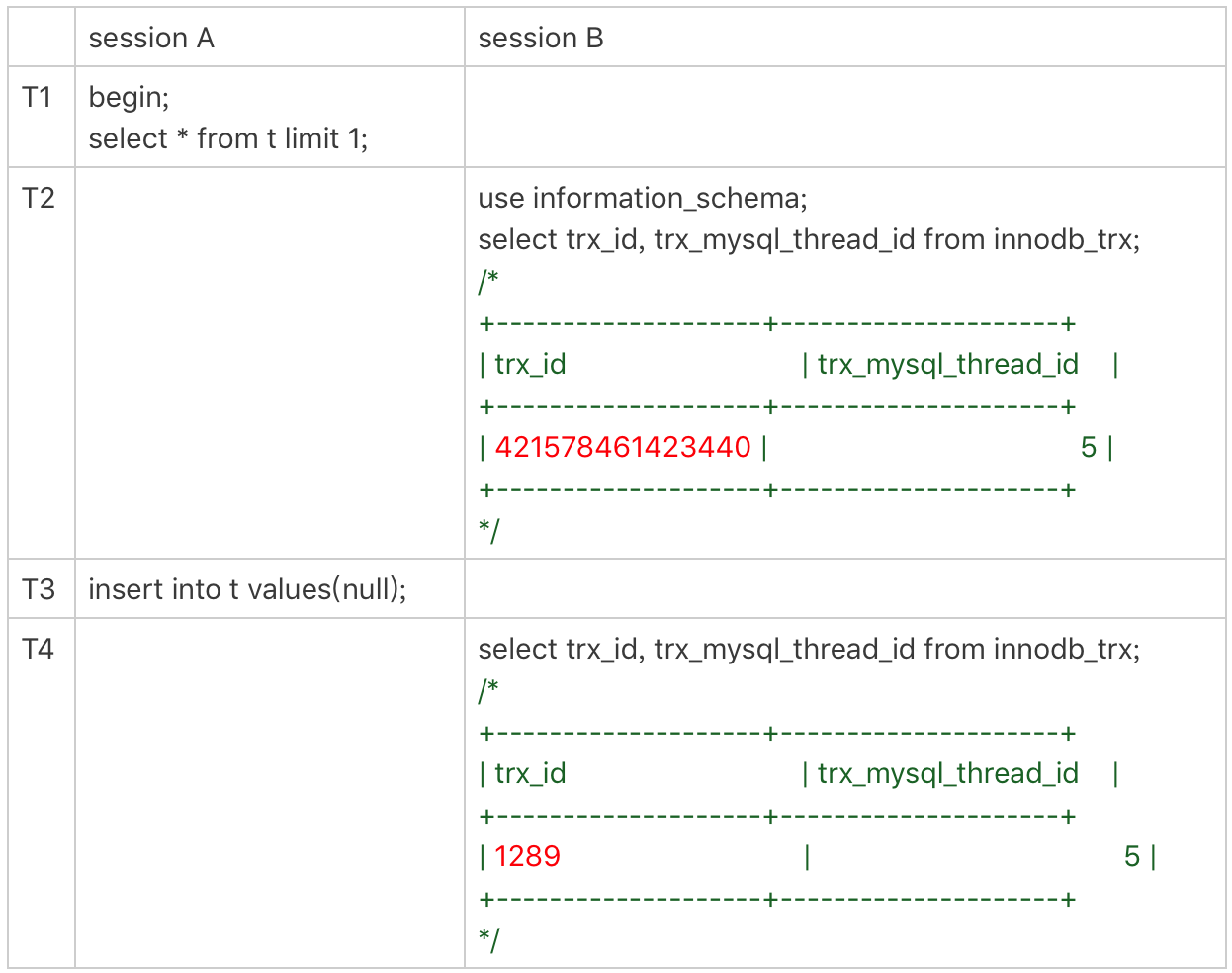 可以看到,只执行读取操作时显示的 trx_id 是一个非常大的值,T4 时刻则是 1289