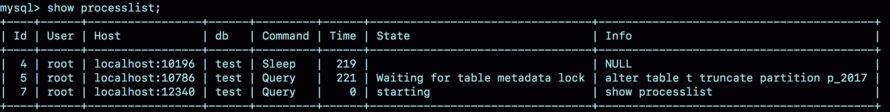 所以这也是 DBA 同学常说的,分区表做 DDL 的时候影响更大,如果是普通分表起码 truncate 一张表的时候不会跟另一张表的查询语句出现 MDL 锁冲突