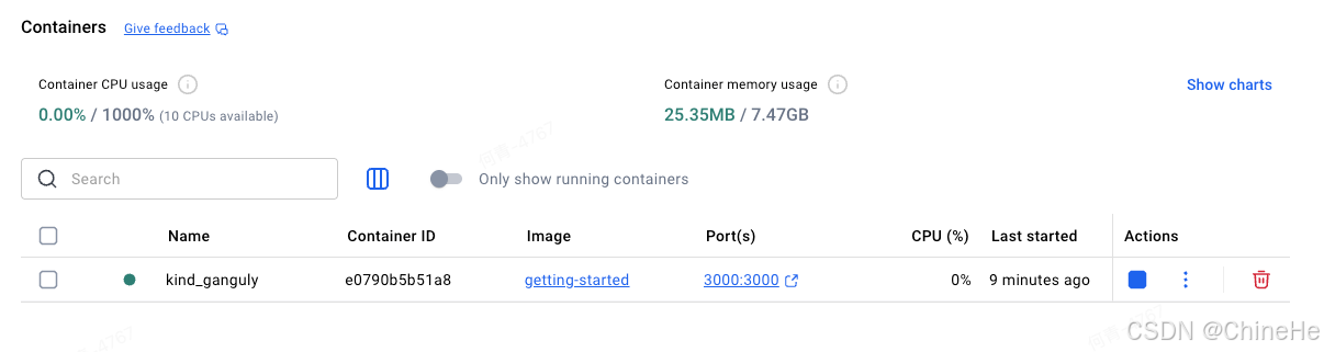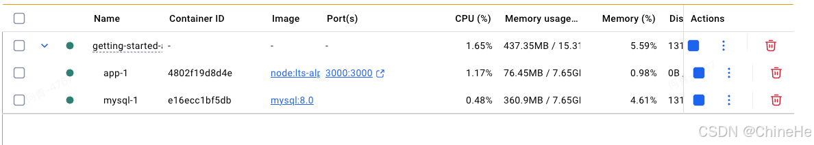 在Docker Desktop的仪表盘中,会有一个叫getting-started-app的组。这是Docker Compose的项目名称,用来将容器分组在一起。默认情况下,项目名称也就是compose.yaml文件所在的目录名称。