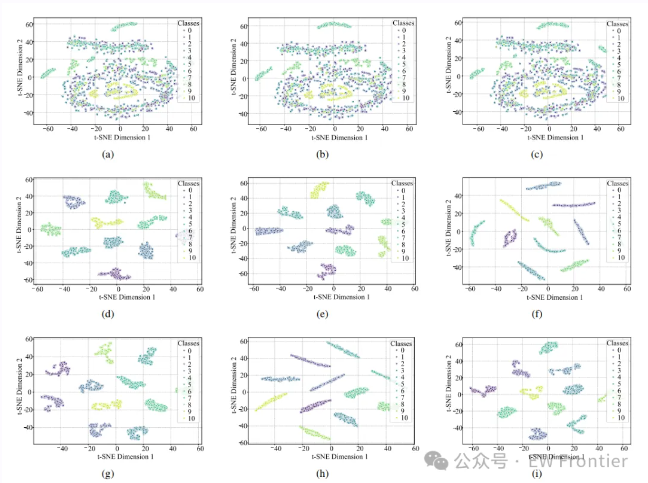 为所提网络提供物理解释:通过t-SNE算法可视化AWSPNet关键阶段的特征分布,分析主要模块的功能作用,揭示特征可分性的逐步实现过程。
