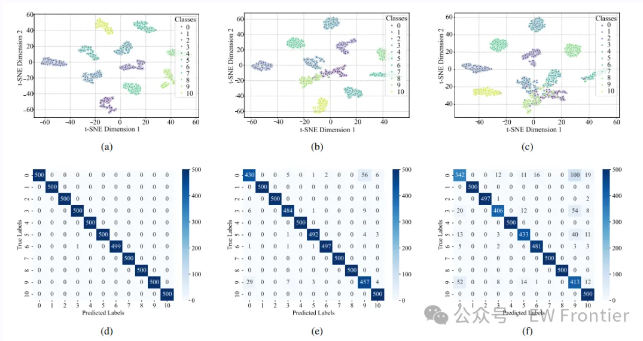 实验结果验证了AWSPNet架构的有效性:消融实验表明,DTCWT模块、注意力机制和预训练权重迁移学习的融合是模型在低SNR条件下实现高性能的基础(-6 dB SNR时准确率达90.45%);t-SNE可视化分析进一步揭示了模型的内在机制,表明特征聚类的可分性与不同噪声水平下的分类准确率密切相关,且完整的集成架构是实现有效特征分离的必要条件。