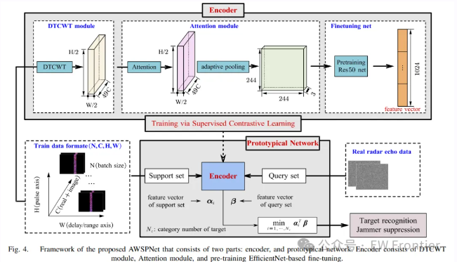 AWSPNet的架构主要包含两个核心阶段:用于雷达回波数据特征提取的多组件"编码器",以及利用这些特征进行分类和少样本学习的原型网络,整体框架如图4所示。