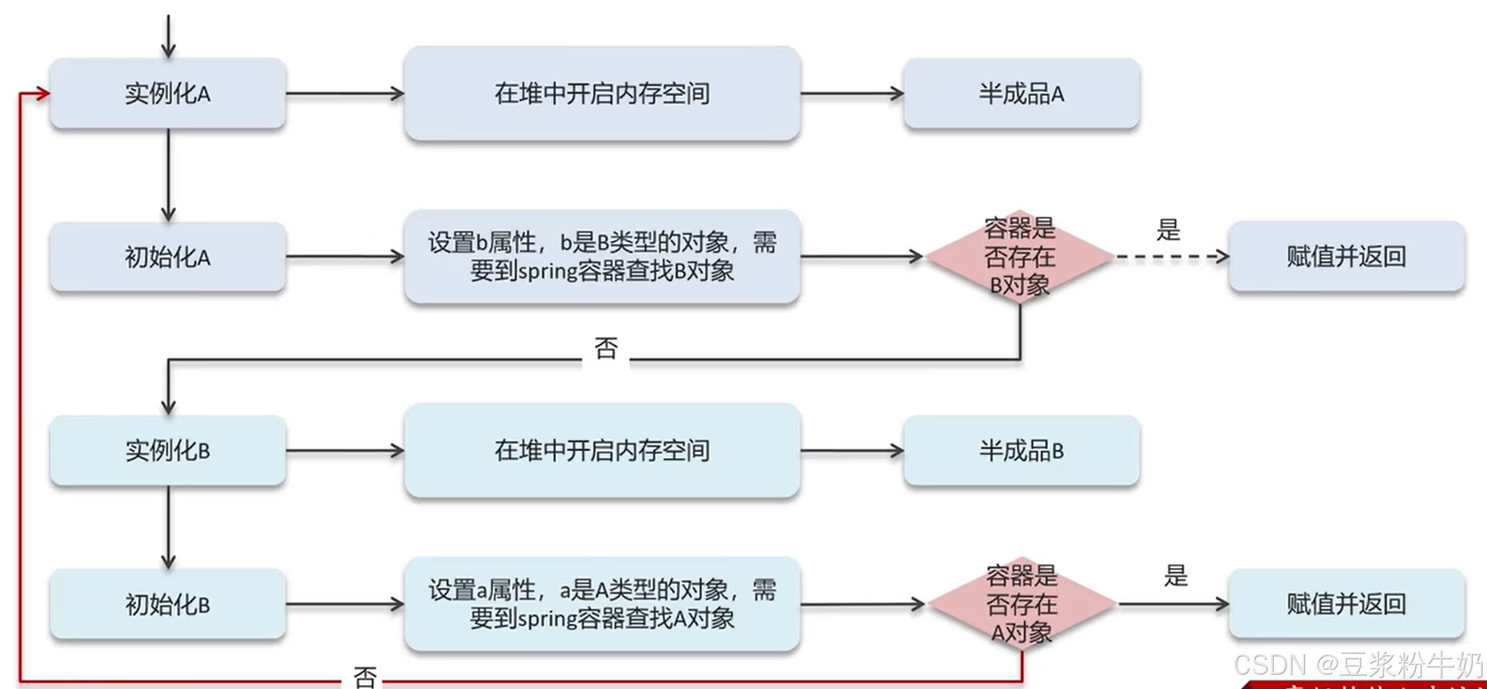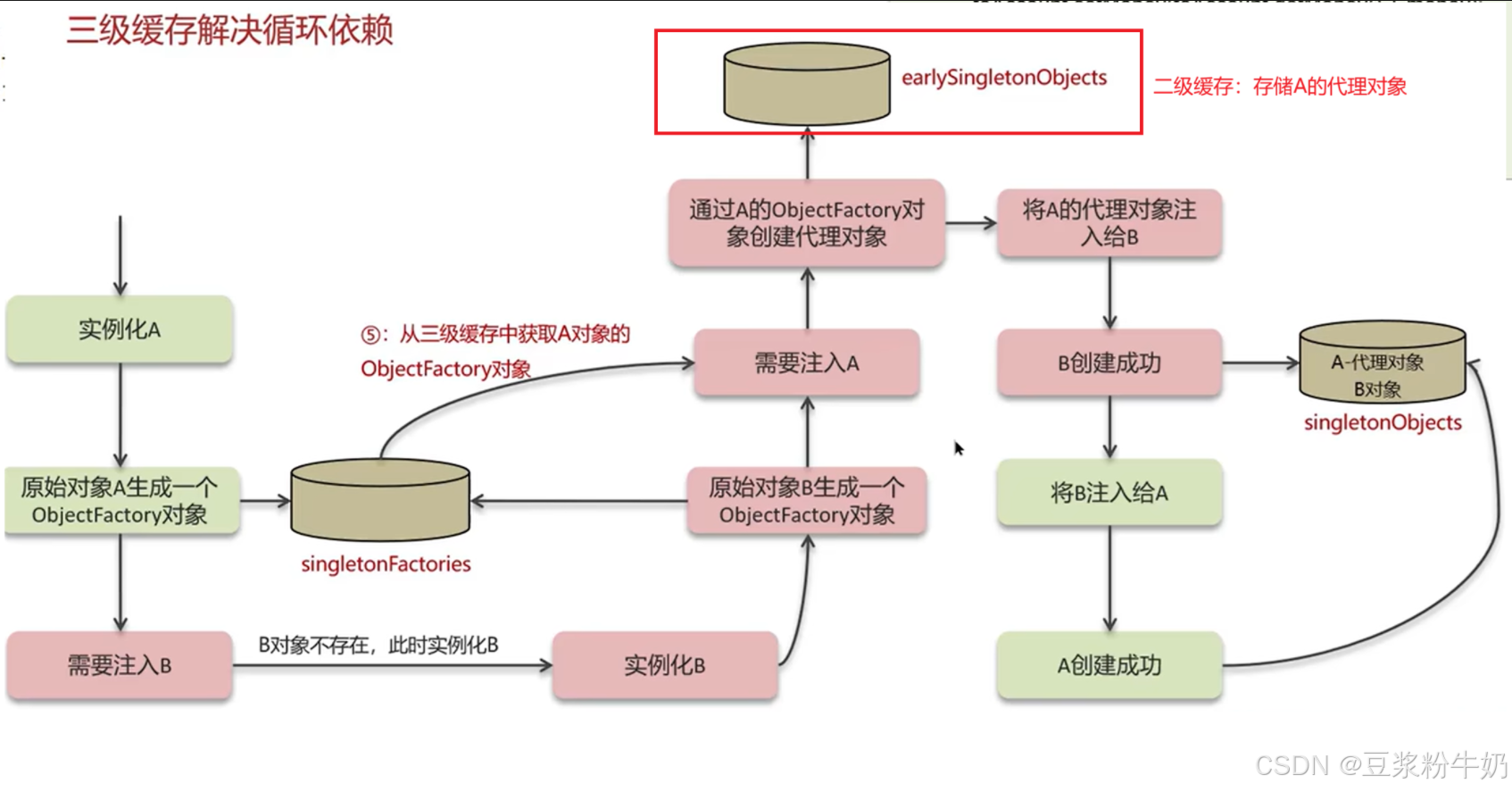 因为A是单例的,不能再次实例化一个代理对象;后面想使用就直接使用二级缓存的代理对象;