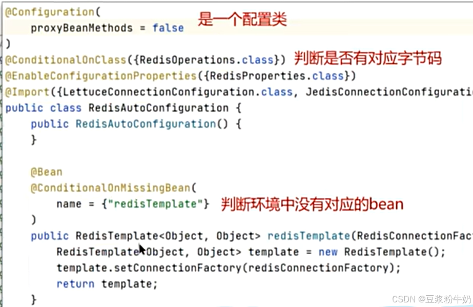 引用依赖之后程序启动前会判断是否有RedisOperations这个类对应字节码,如果有执行下面代码,判断当前环境是否存在RedisTemplate这个bean,如果存在就不加载,没有执行下面代码返回RedisTemplate对象并注入Spring容器中。