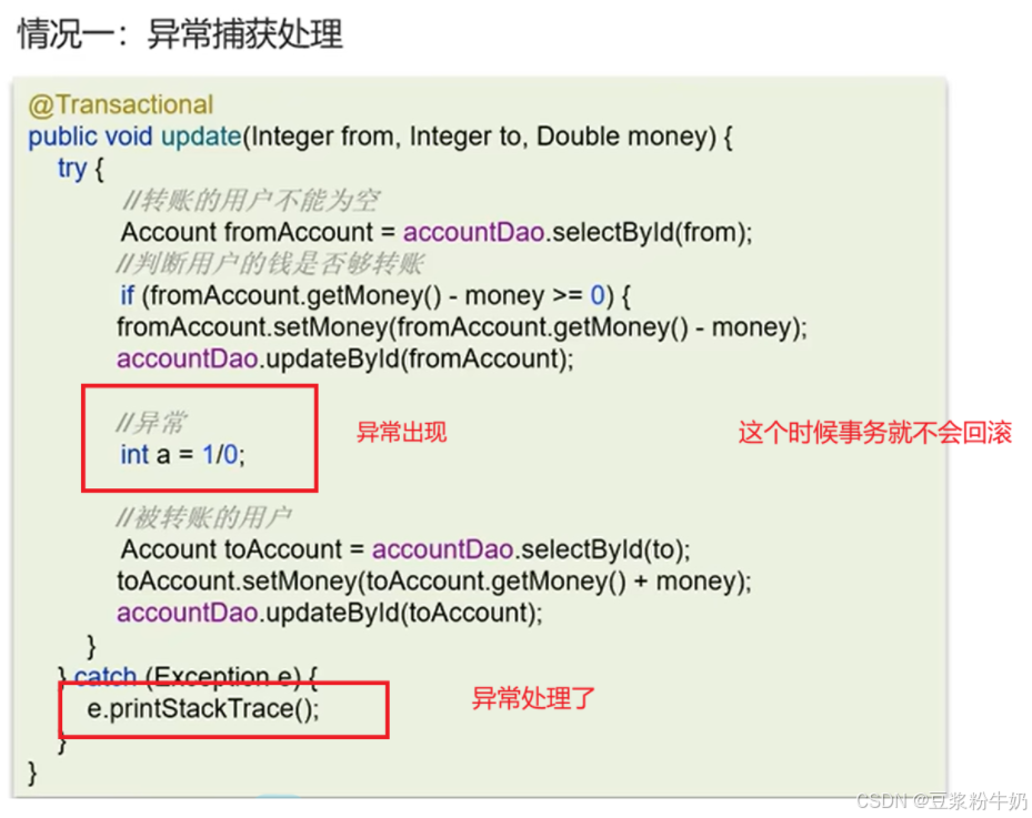 异常捕获处理之后,事务处理以为没有报错,就不会回滚,执行到哪里就到哪里。