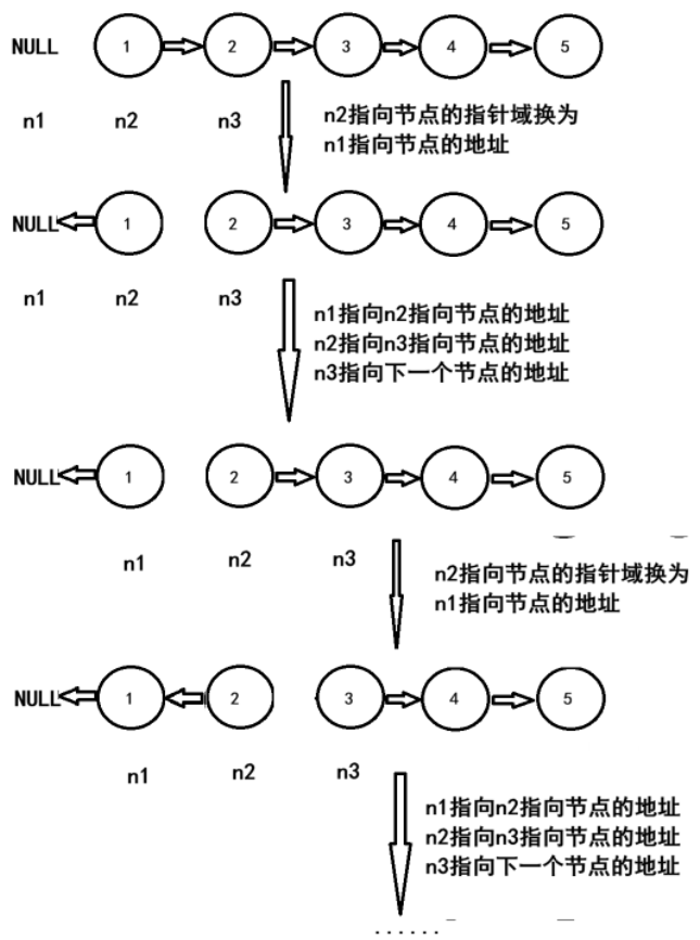 初始时,n1指向NULL,n2指向头节点,n3指向第二个节点