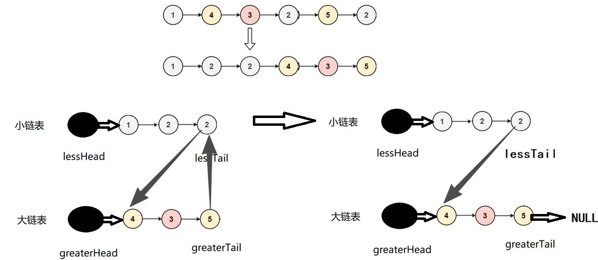 小链表:lessHead,lessTail