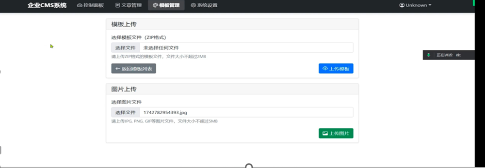 (6).出现新功能,第一个存在模板上传漏洞,第二个图片上传漏洞,其中图片直接过滤了<?php ;?>这种标签,也没有返回上传地址,利用<script language="php">phpinfo();</script>