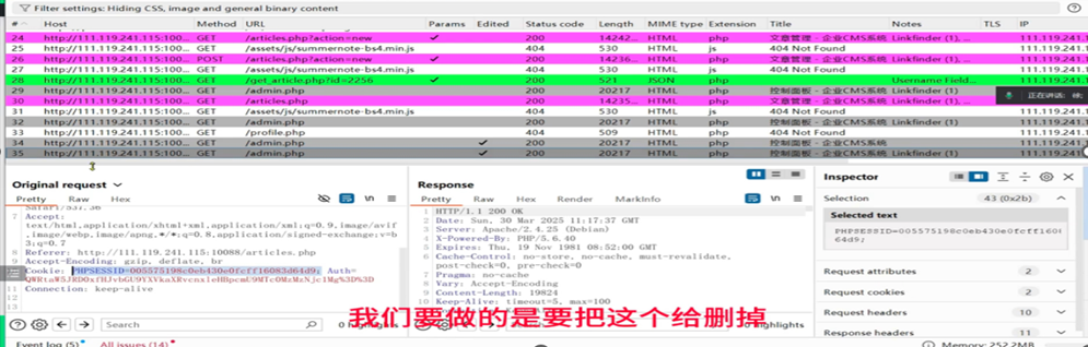 (4).只能爆破普通用户登录用户之后,发现没权限,对于输入都进行实例化处理,所以sql注入是不能实现的,对于界面的增加删除修改都不能处理,那我们去bp里面看看历史http记录里面有什么,发现index.php的cookie里面有PHPSESSID和Auth授权, 进行修改实行**越权,**进行解码,有用户名和分组,我们对他进行一个分组,编码发送