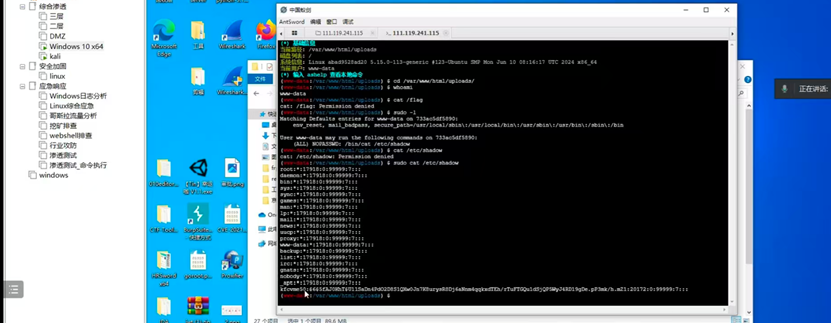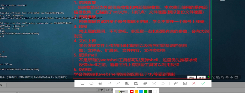 - **对于第一个实例的思考:**首先就是对目录进行扫描,发现一个特殊目录,访问下载了一个sql文件,看见哈希的密码账号,以及账号组等配置信息,破解后登录账号,然后用http的历史记录看见有特殊的信息,修改一下Auth,并删除PHPSESSID,发现提权成功,访问一下出现新的,有一个模板注入,一个文件上传漏洞,文件没有过滤后缀php过滤了文件内容<?php?>使用<script>标签,发现漏洞可以执行,上传代码,后续看源代码,发现后缀被改成时间_(文件名+文件大小+文件名md5加密前十位)进入后需要sudo或SUID提权用sudo -i或者/etc/shadow,登录后发现需要伪终端,蚁剑连接没有伪终端,换成冰蝎,再上传反弹webshell,创建终端which socat/python/script,登录用户再查看/etc/shadow查看密码,哈希包皮,再提权使用sudo -l 或者/bin/bash -p