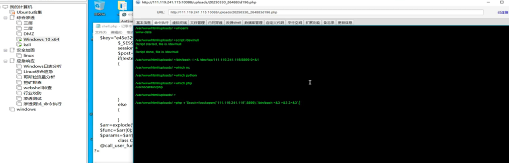 (11)本地开放8899端口,进行反弹shell发现反射连接不上,与程序有关,找一下本地的那些程序which nc,python,php,php有网站呈现的,反弹php,反弹php成功,但是还是不能su切换,没有终端,which socat/python/script,使用script/dev/null创建成功