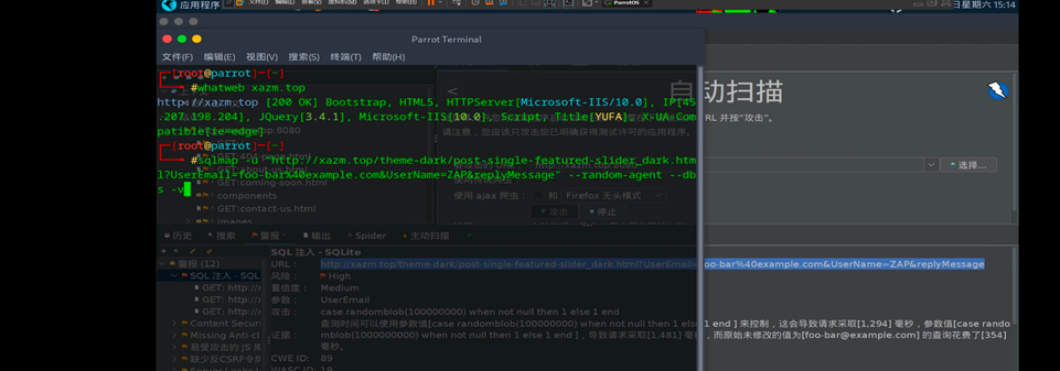 (7)查看ZAP显示有没有漏洞,有进行测试是否存在,里面显示sql使用sqlmap扫一些,发现是空的并不存在