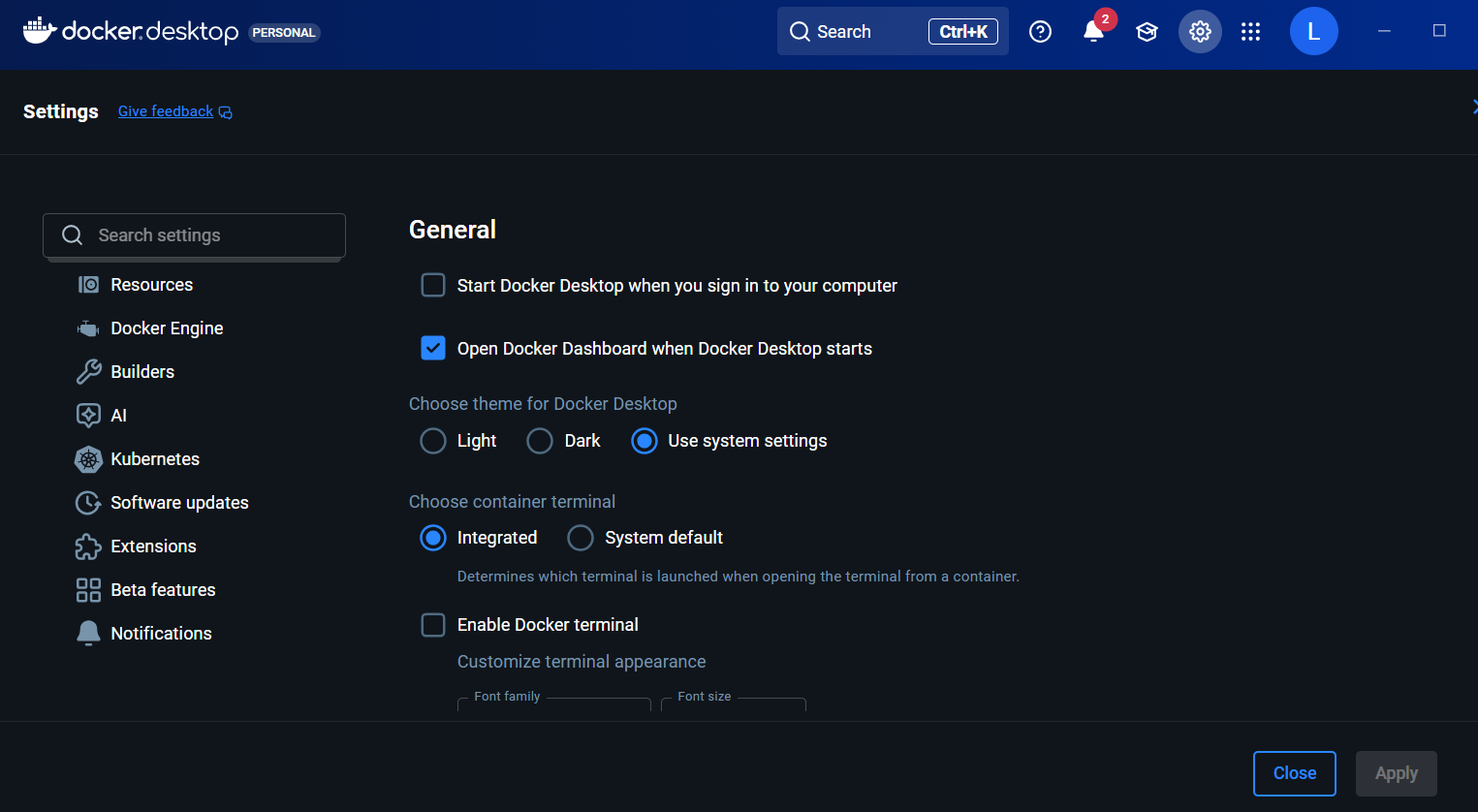 打开 Docker Desktop,点击右上角的齿轮图标进入Settings