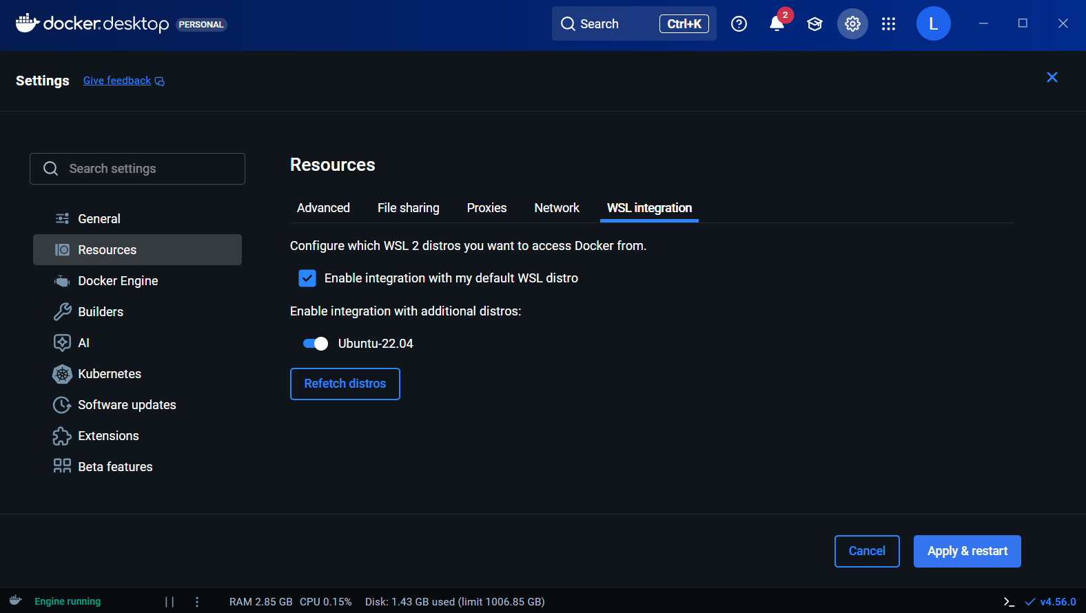 开启 WSL 集成后,Docker Desktop 会把Docker引擎直接部署到你的 Ubuntu-22.04 环境中。这样你在 Ubuntu 终端里执行 docker 和 docker compose 命令时,就会直接调用 Docker Desktop 的引擎,两者无缝衔接。