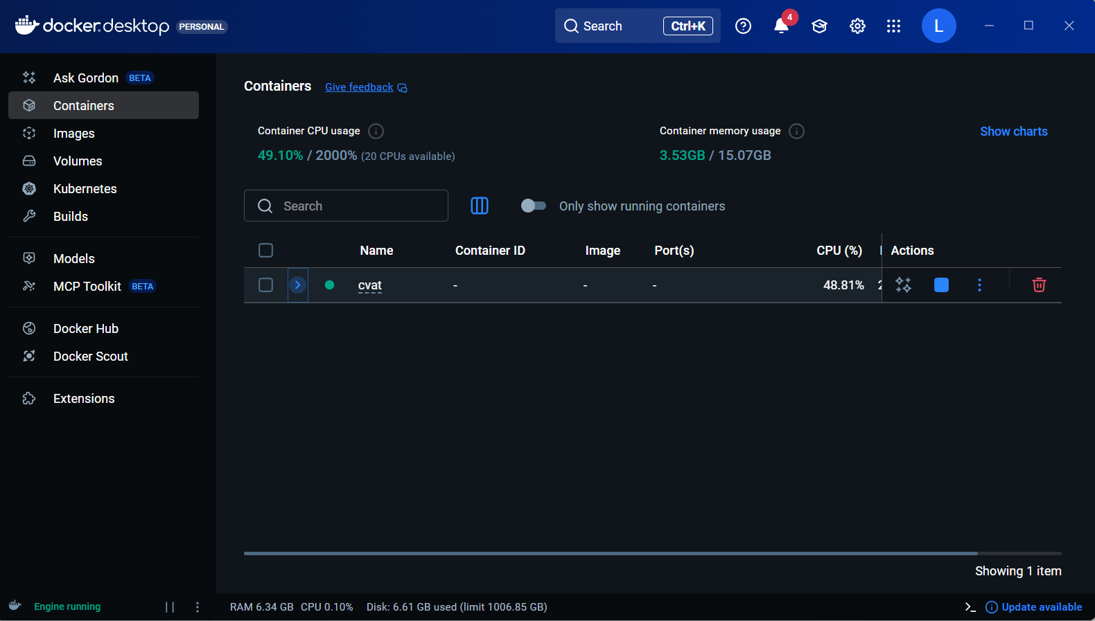 后续要打开CVAT,只需打开 Docker Desktop,启动CVAT 容器(电脑关机会自动关闭),就能通过访问浏览器进入CVAT 界面了